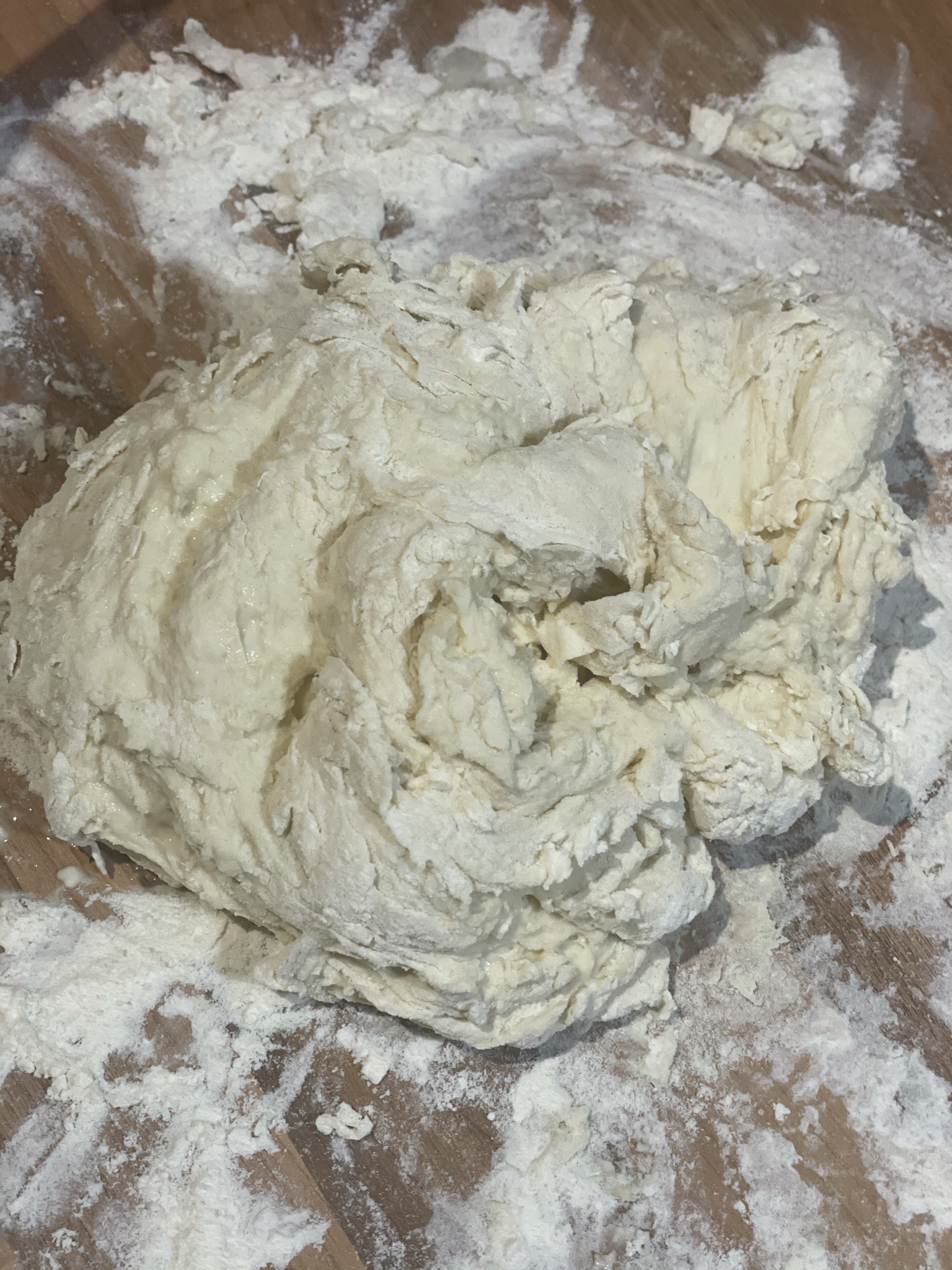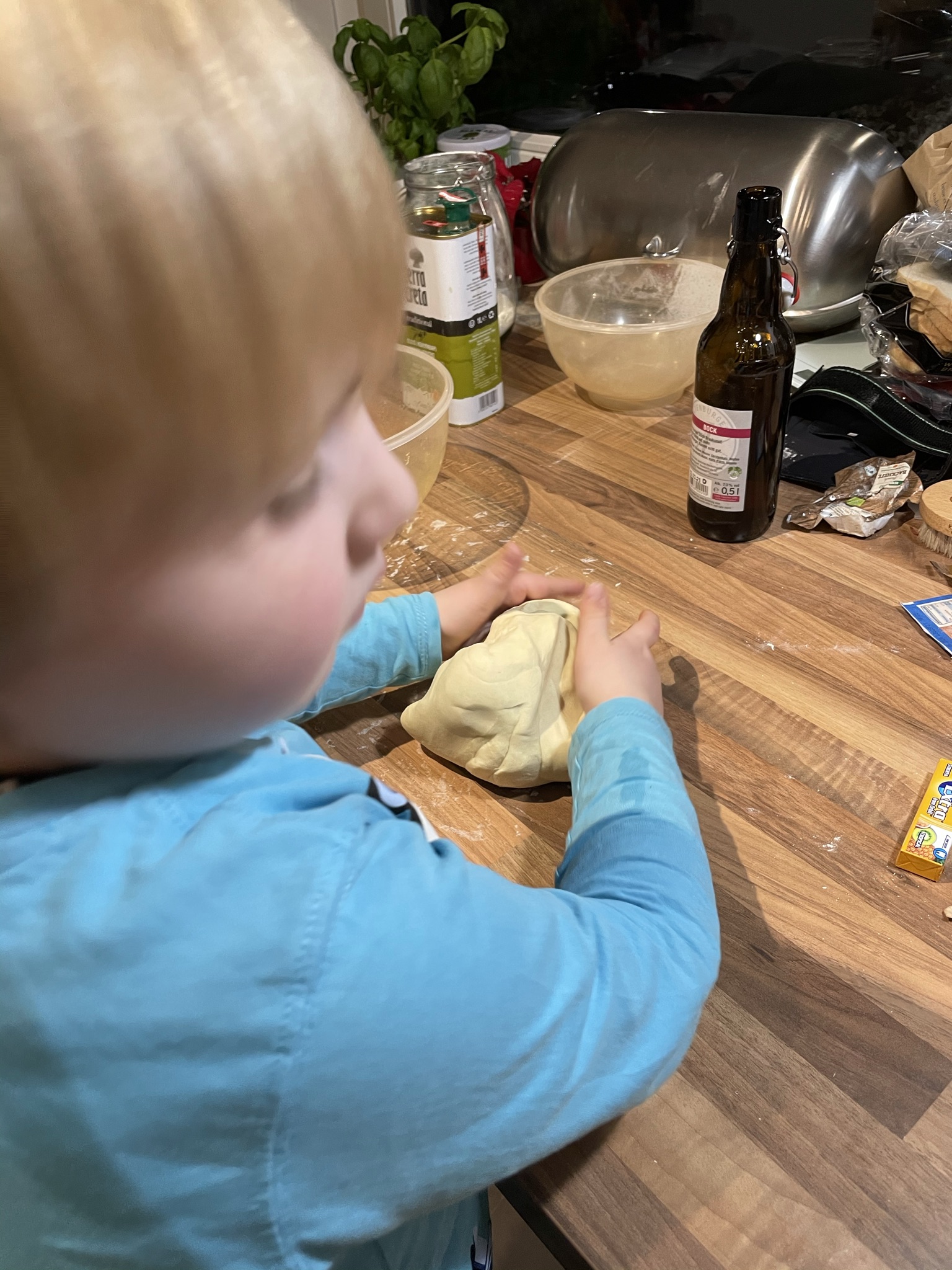 - Alles zu einem Teig verarbeiten und etwa 10 Minuten kneten, dabei auch gerne mit einem Assistenten arbeiten 🙂